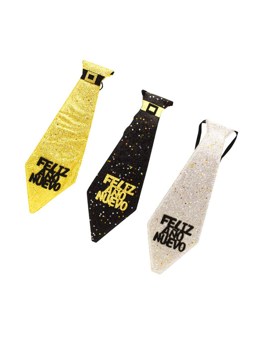 Ver todos los detallesCorbata de tela con la frase "FELIZ AÑO NUEVO", detalles de brillos y elástico para colgarse Características: Disponible en color: Negro, Plata y...