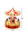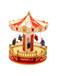Carrusel navideño decorativo con tonos rojo, dorado y blanco, diseño inspirado en los tradicionales carruseles festivos. Cuenta con iluminación integrada que realza su diseño y crea un ambiente cálido y festivo.