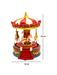Carrusel decorativo con tonos rojo, dorado y blanco, incluye figuras de caballitos que hacen referencia a las ferias clásicas. Cuenta con iluminación integrada que realza su diseño y crea un ambiente cálido y festivo