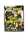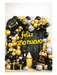 El set incluye globos en tonos negro, plateado y dorado, además de figuras decorativas y globos metálicos