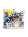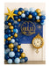 El set incluye globos en tonos azul y dorado, además de figuras decorativas como estrellas y globos metálicos