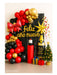 El set incluye globos en tonos negro, rojo y dorado, además de figuras decorativas como estrellas, moños, botellas y globos metálicos