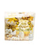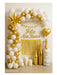 El set incluye globos en tonos blanco y dorado, además de figuras decorativas como estrellas y globos metálicos