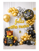 El set incluye globos en tonos negro, plateado y dorado, además de figuras decorativas y globos metálicos