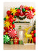 El set incluye globos en tonos tradicionales de Navidad: rojo, verde, dorado y diseños impresos tipo caramelo, además de figuras decorativas como bastones, estrellas y globos metálicos
